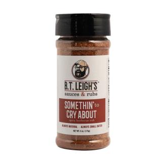 BT Leigh's Somethin' to Cry About Spicy Barbeque Rub- Sweet, salty, smoky and savory upfront flavor with a spicy heat that bursts after about 10 seconds. The heat profile may come in two waves and increases over time. Are you a fan of thrilling culinary experiences when it comes to BBQ? If so, this might be the perfect match for you. The taste is a delightful combination of savory and sweet flavors that meld into a spicy explosion of heat, leaving your taste buds tingling with excitement. This blend is sure to make your mouth water, and maybe even cause your eyes to water a bit too.