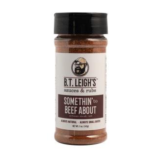 BT Leigh's Somethin' To Beef About Artisan Steak Rub- Salty, smoky and savory umami flavors combined with a slight heat and bright tang. No Sugar/Keto/Paleo. We want to make it clear that we're not looking for trouble here. However, we must say that the combination of Aleppo chili flakes, powdered horseradish, and cracked black pepper brings a powerful punch to your taste buds. Don't be afraid to use it generously to elevate the flavor of your favorite cuts of beef and wild game. This blend complements any type of beef, such as ribeye or porterhouse steaks, as well as hearty red meats like bison or venison. It also works wonders on pork, chicken, and root vegetables. For a unique twist, try using it as a sprinkle over your macaroni and cheese dish!